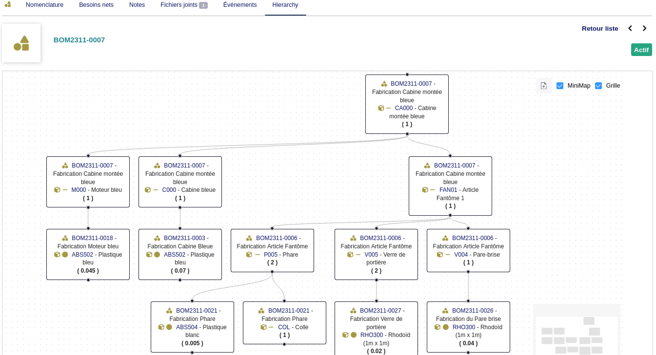 Cet onglet affiche une vue hiérarchique de la nomenclature et ses sous-nomenclatures éventuelles.