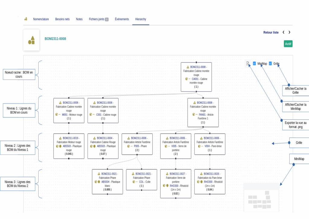 Cet onglet affiche une vue hiérarchique de la nomenclature et ses sous-nomenclatures éventuelles.