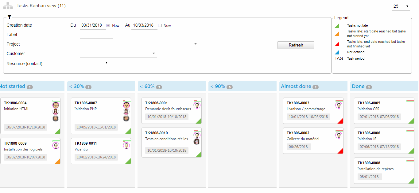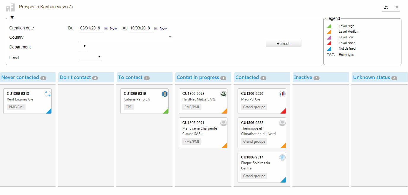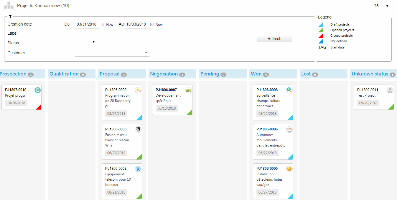 It allows to visualize the current states of these elements in columns and makes it possible to pass an element from a state to another by simple Drag & Drop from one column to the other when the Dolibarr business rules allow it.