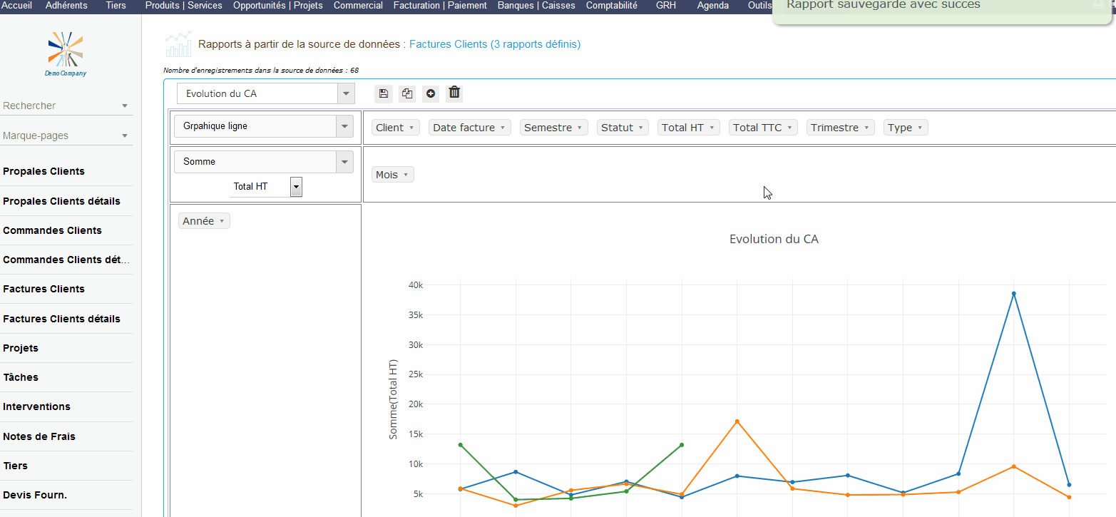 The Pivot Reports module for Dolibarr allows to define Data Sources and to create Pivot reports by simply dragging and dropping the fields of the selected data source.