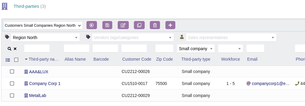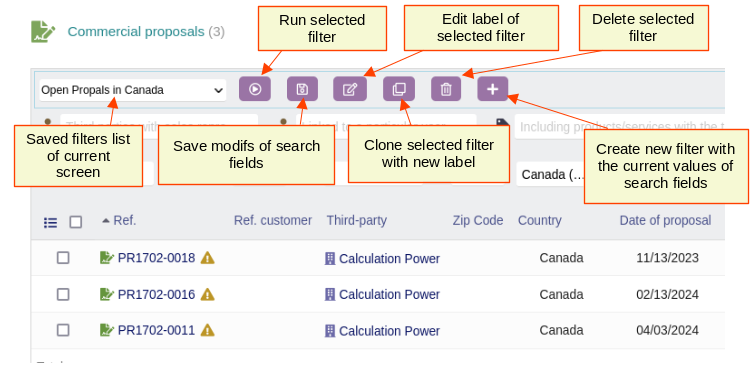 The buttons of the toolbar allow you to save, modify, clone, … the filters of the Dolibarr list.